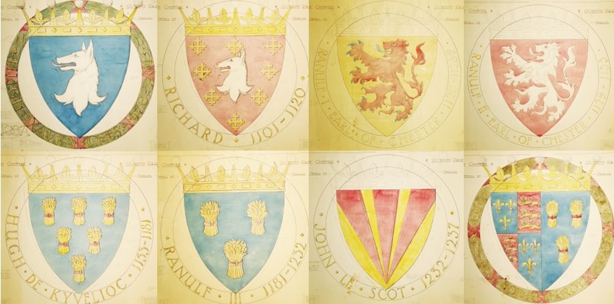 The first suspension bridge from the Groves to the new housing at Queens Park was built in 1852. This first bridge was replaced in 1923 by the Corporation at a cost of £7,000. These drawings are of the heraldic coats of arms of eight Norman Earls of Chester which decorate the arches above the bridge. The drawings are by architects F.A. Roberts and P.H. Lawson of 88 Foregate Street, Chester.Why conserve these plans when we have so many others that need our care?